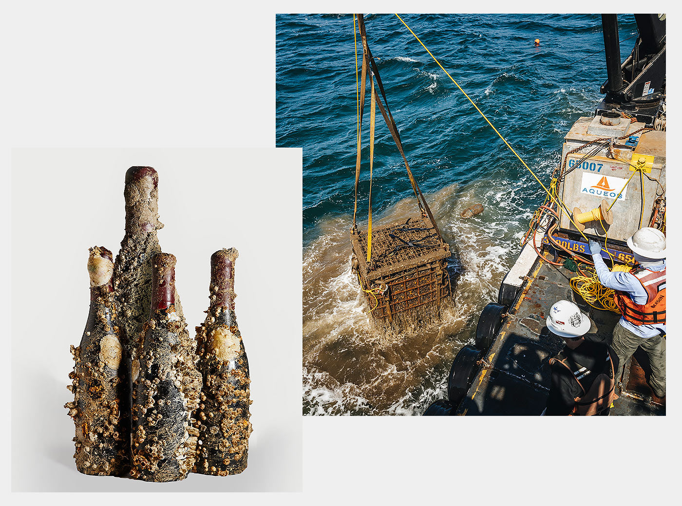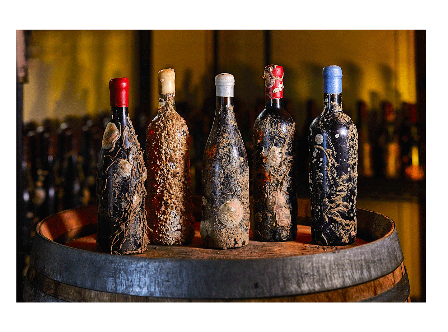 Resting beneath sea level, the wine inside the bottles evolves into the most superior and unique we have ever tasted. Outside, each glass vessel becomes distinct, adorned with jewel-colored barnacles, coral, and sea shells. Just like snowflakes, no two bottles are the same.